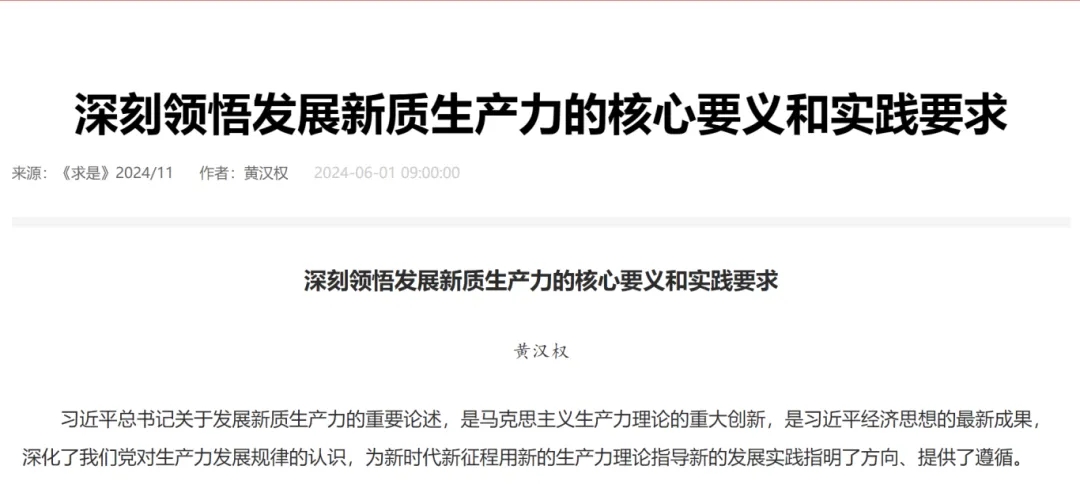 最新一期的《求是》雜志,刊發中國宏觀經濟研究院院長黃漢權的署名文章《深刻領悟發展新質生產力的核心要義和實踐要求》。