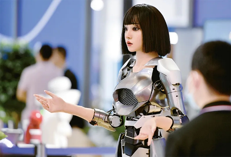 當前數字化浪潮席卷全球,正在不斷推動新質生產力的形成與發展。2024年5月24日,以“釋放數據要素價值,發展新質生產力”為主題的第七屆數字中國建設峰會在福建福州開幕。圖為當日峰會現場體驗區的超仿生人形機器人“小柒”在向觀眾致意。 新華社記者 魏培全/攝